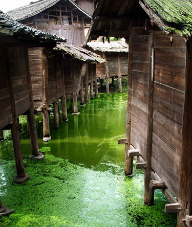 在贵州省黔东南州雷山县大塘乡新桥寨,至今仍保留着大量奇特又实用的“水上粮仓”。这些粮仓建在村寨的水塘中,为全木结构,底部立在露出水面的石墩上,把木质粮食仓库科学地修建在池塘之中,别具一格,既防火,又防鼠,同时,池塘中还可以养鱼、养鹅、养鸭,一举多得。 整个水上粮仓,全杉木结构,各仓的立柱,也大小不一,仓柱胸径大的35厘米以上,小的也有30厘米左右。柱选用方石垫脚,岩石垫脚需超出水面。水塘上诸仓,不少经年日久,木柱脚外层已朽成倒瓶颈模样,可柱心仍然坚固鼎立。建仓的大水塘面积有三千三百余平方米,为村民出入仓方便,按仓排位“分割”数块,但排序井然,错落有致。