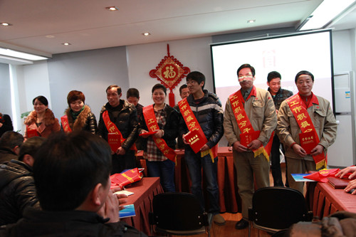 2013年2月2日下午1点,杭州富义仓米业有限公司2012年终总结暨先进表彰大会在四楼会议室如期召开。大会的第一项议程是对公司2012年度先进员工进行表彰,并由先进员工代表上台发言;随后公司总经理朱立树同志对企业2012年度的工作进行总结与分析;会议的第三项议程是对2013年度各部门中层负责人宣读任命文件,最后会议在轻松的音乐里圆满结束。