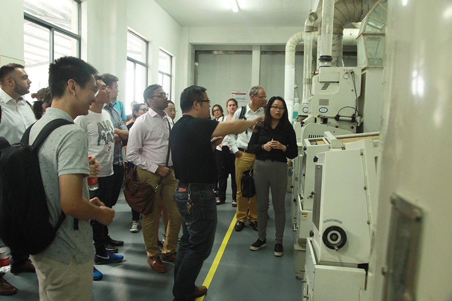 在了解了稻米文化之后,访问团陆续参观了产品展示厅和大米生产一车间,叶总向成员们介绍了各类机器的用途。让外国友人们近距离的了解大米的生产过程。